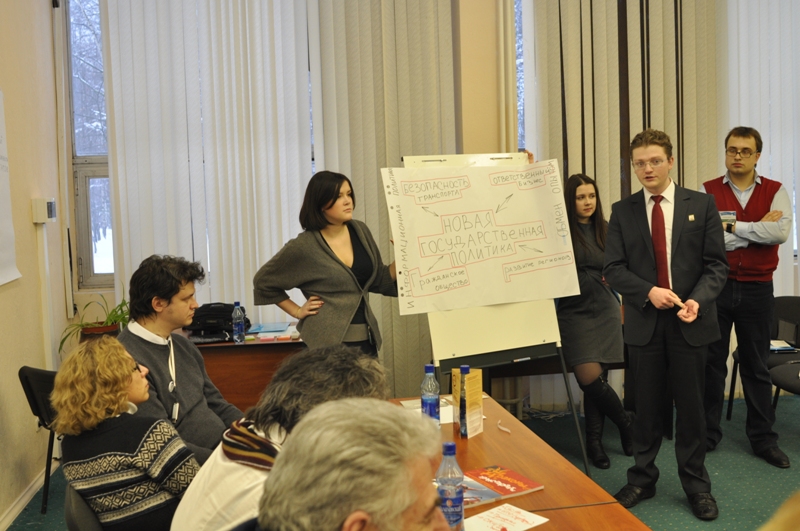 Для решения этой задачи были сформировали четыре рабочих группы — «Государство», «НПО», «Граждане», «СМИ». И работа закипела. Для оценки предложений рабочих групп было созвано жюри из преподавателей и группа независимых наблюдателей из числа слушателей Школы. На презентациях группа «Государство» предложила сделать упор на улучшение социальных условий жизни населения, группа «НПО» выделила значимость просветительской работы с населением, поручив ее государству, группа «Граждане», напротив, выступила с лозунгом «Если не мы — то кто?!», подчеркнув значение гражданской солидарности, а группа «СМИ», представленная профессиональными журналистами, обосновала, что пресса — основной инструмент коммуникации общества, а не власти. Жюри осталось довольно итогами работы групп и наградило лучших участников авторскими книгами.